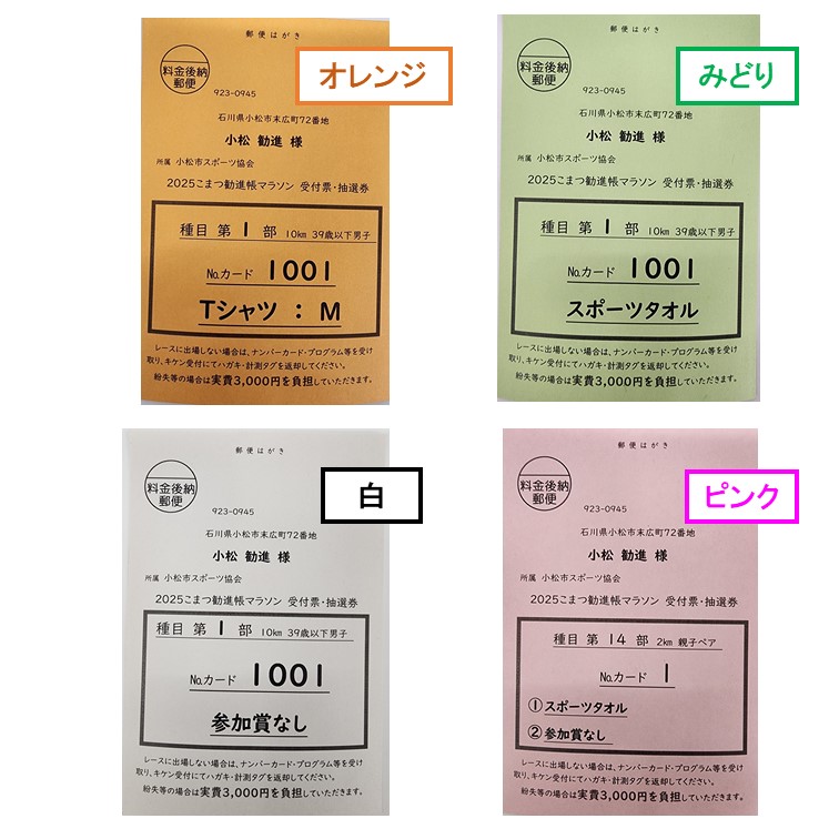 と色分けになっていますのでハガキを確認し申込内容と違う場合は事務局までご連絡ください。(0761-23-5961 平日8:30〜17:00)