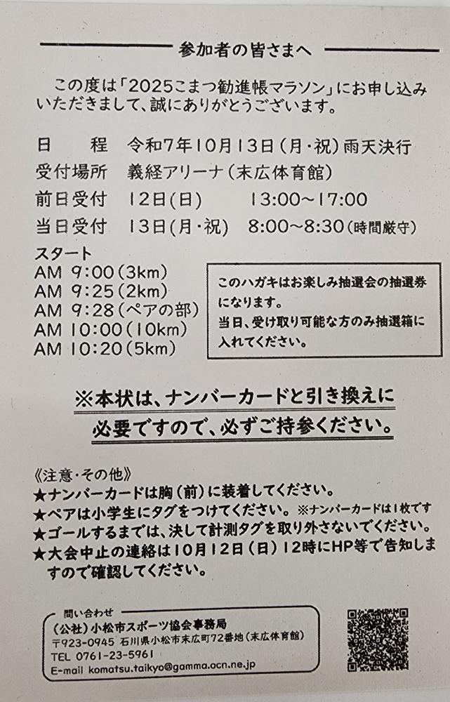 まず、第一段階の【2025こまつ勧進帳マラソン受付票・抽選券】案内ハガキを発送しましたので、近々に届くと思います。お待ちください![]()