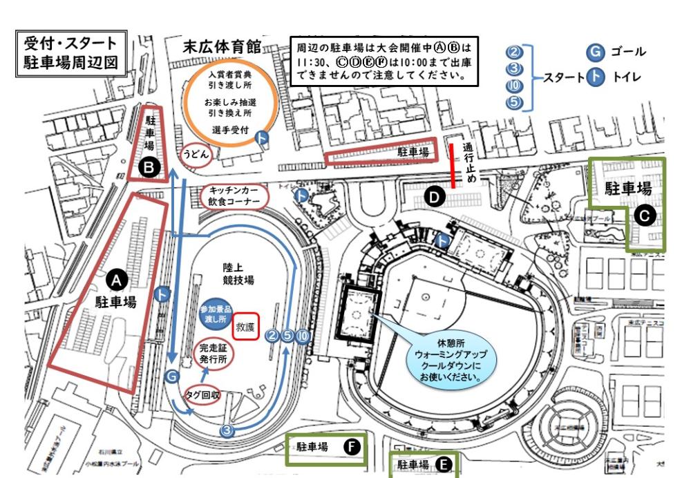 大会中は道路がコースの為、陸上競技場周辺の駐車場は時間帯によって出庫できない場合があります。