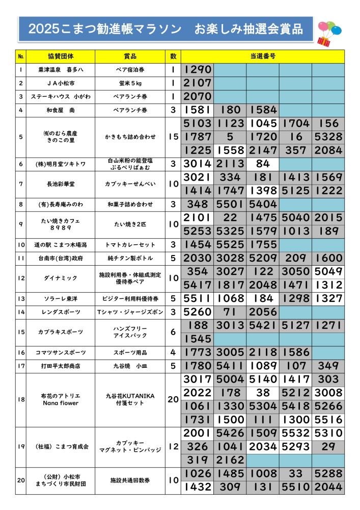 お楽しみ抽選会 当選番号発表